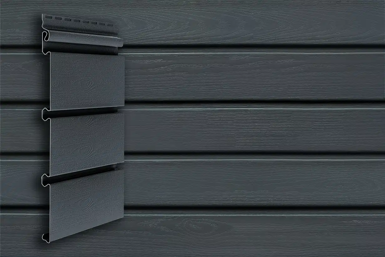 Сайдинг виниловый Архитектурный планкен Grand Line Acryl 3000*285мм графит 0,74м² - напоминает доску для обшивки фасада с закругленными или скошенными торцами. Текстура дерева на сайдинге делает его вид максимально натуральным.