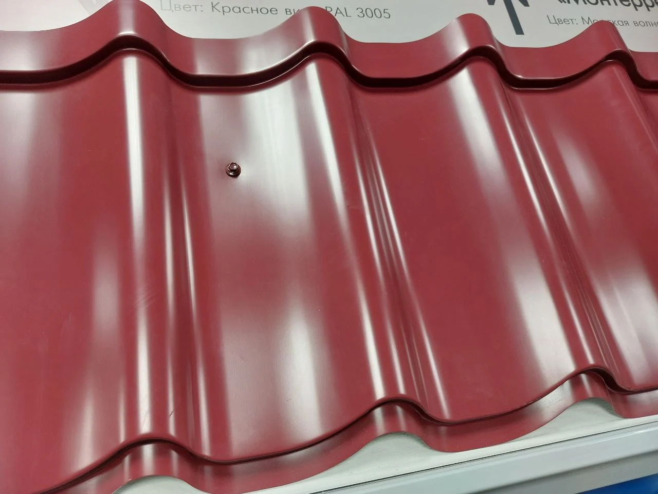 Профиль кровельный "Монтеррей" 1180 (1100) ПА, ПХ, ПЮС (0,65/3005 красное вино/16/350) - прекрасный кровельный материал, имитирующий натуральное черепичное покрытие, изготавливается из оцинкованной стали с полимерным покрытием. Благодаря своей простоте, надежности и доступной цене, кровля для дома по типу металлочерепицы является самым популярным из всех современных кровельных материалов.