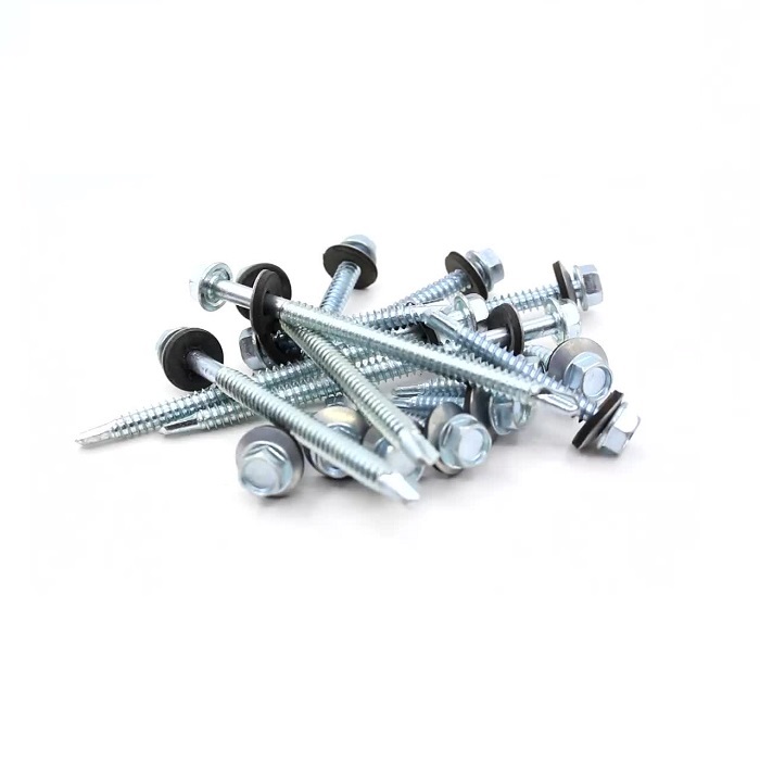 Особенности конструкции: шестигранная головка, шайба с резиновой прокладкой. Наконечник сверловидный. Резиновая прокладка служит для гидроизоляции крепления.
