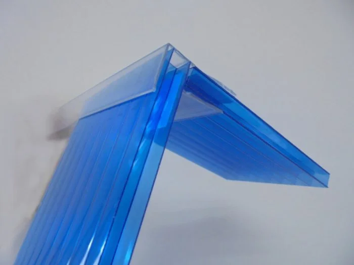 Угловой профиль для монолитного поликарбоната достаточно тяжело монтируется. Необходимо сначала надеть профиль на один из стыкуемых листов, а затем аккуратно вставлять второй лист в профиль. Для удобства и защиты от соскакивания профиль на первом листе удобно закрепить с помощью саморезов.