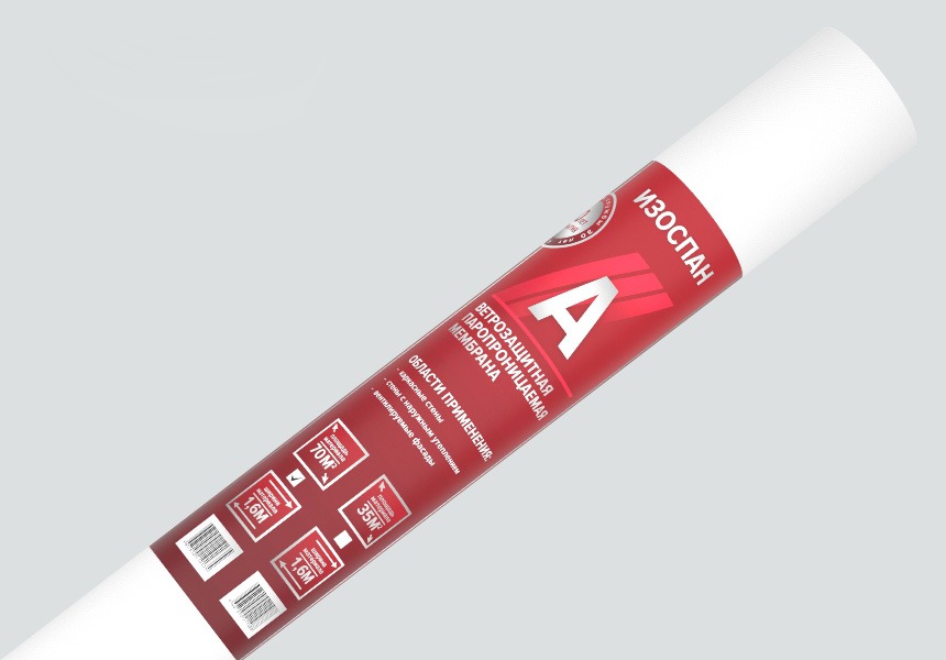 Ветрозащитная мембрана Изоспан A препятствует конвективному движению воздуха через теплоизоляцию, снижая теплопотери. Изоспан A обладает водоупорностью, достаточной для защиты утеплителя и других внутренних элементов конструкций стен от атмосферных осадков, проникающих под наружную обшивку, при этом является паропроницаемым материалом, поэтому не препятствует выходу водяных паров из утеплителя в вентилируемый зазор. Прочность материала способствует устойчивости к механическим нагрузкам на этапе монтажа и в процессе эксплуатации.