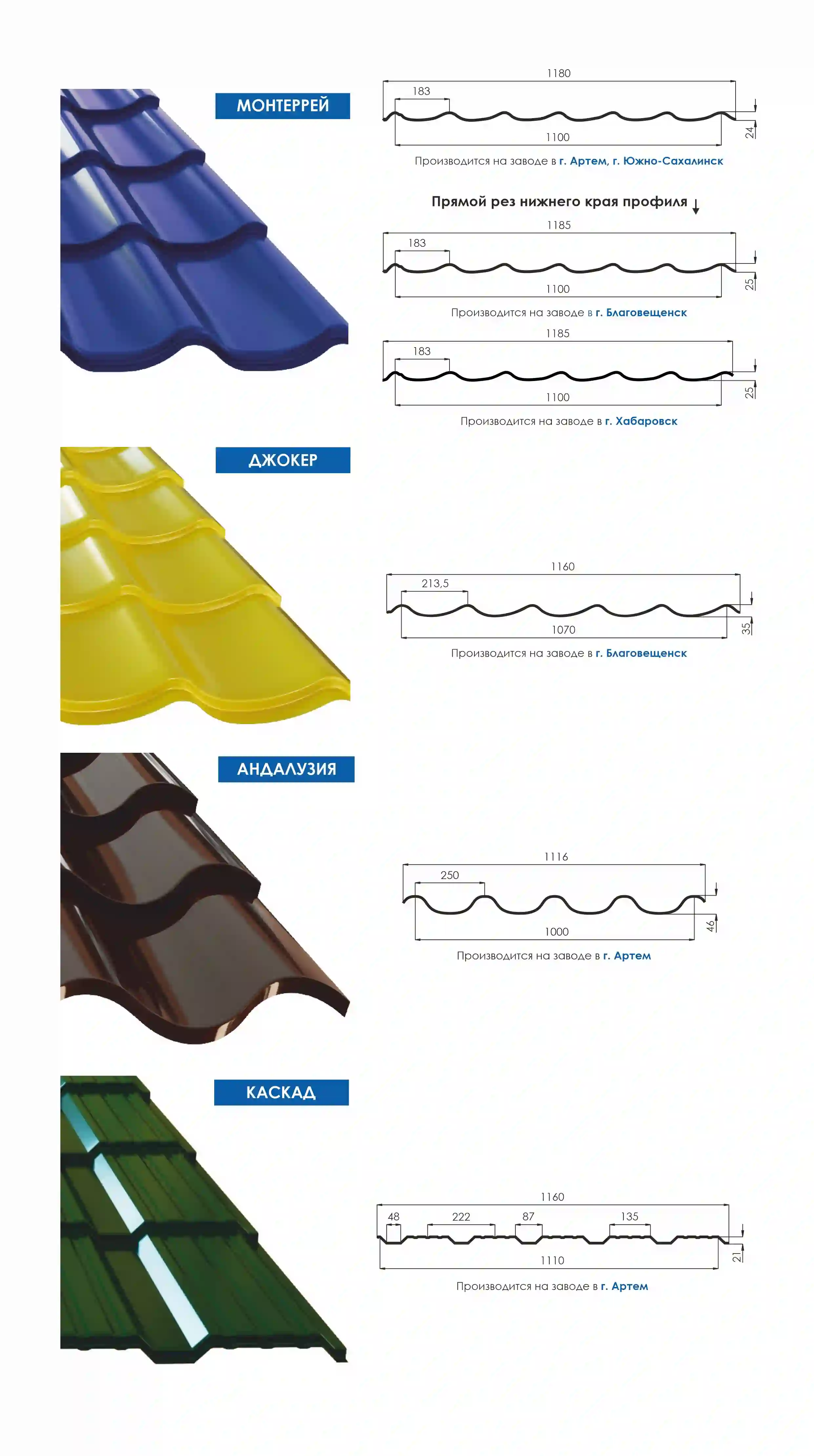 Компания Центр кровли производит кровлю металлическую на собственных заводах в крупных городах Сибири и Дальнего Востока для того, чтобы снизить конечную цену для покупателей и обеспечить самый большой ассортимент в самые короткие сроки в любых объемах.
