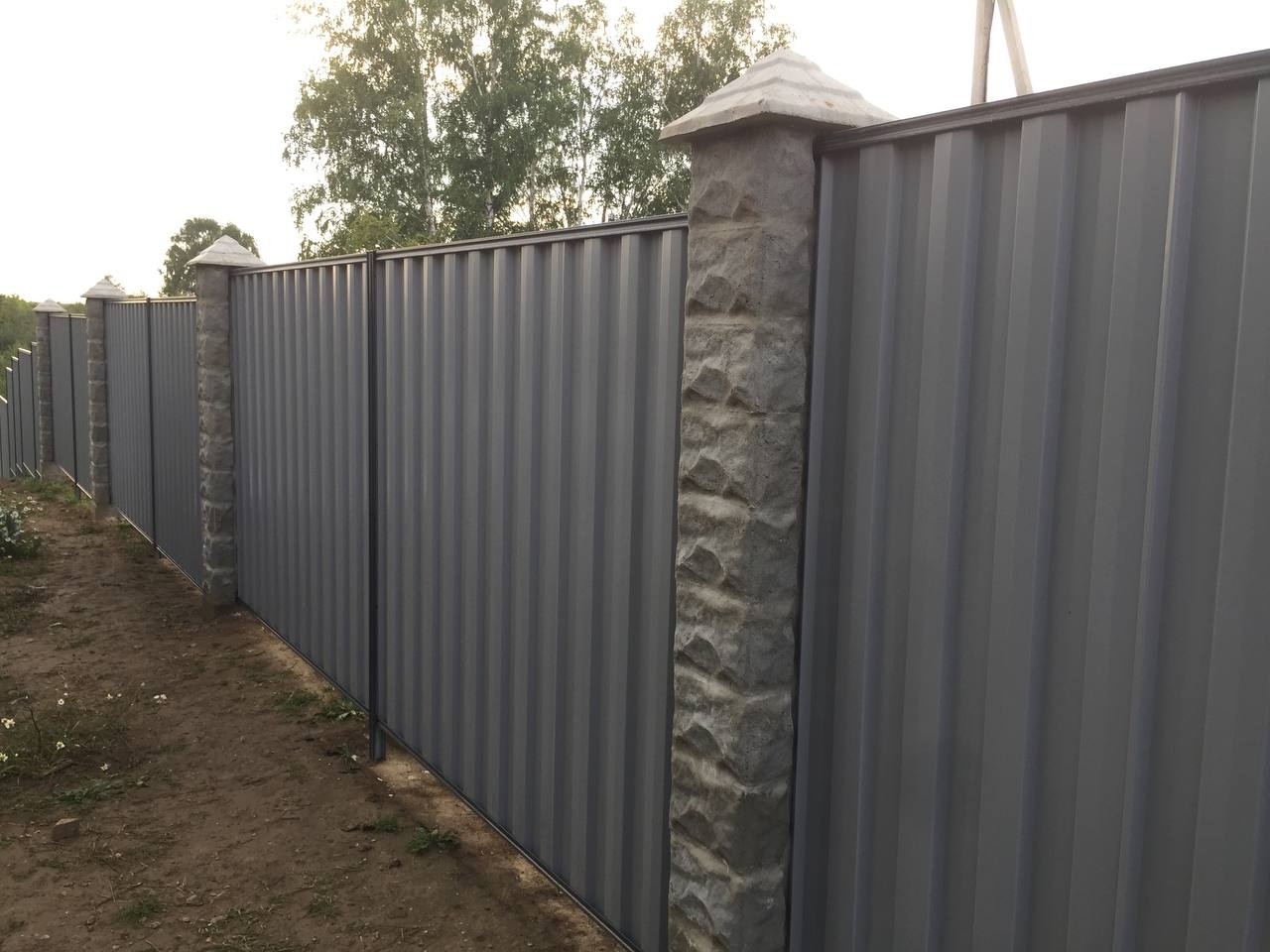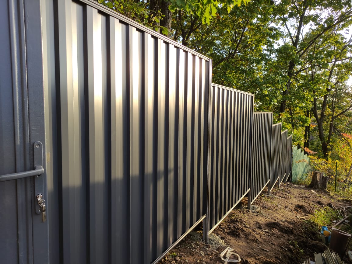 Сплошной забор с уникальным по форме профнастилом. Быстрая и удобная сборка без сварочных работ. Подходит как для монтажа на трубы Marsell 63х83 мм, так и для профильных труб с сечением 60*60 мм.