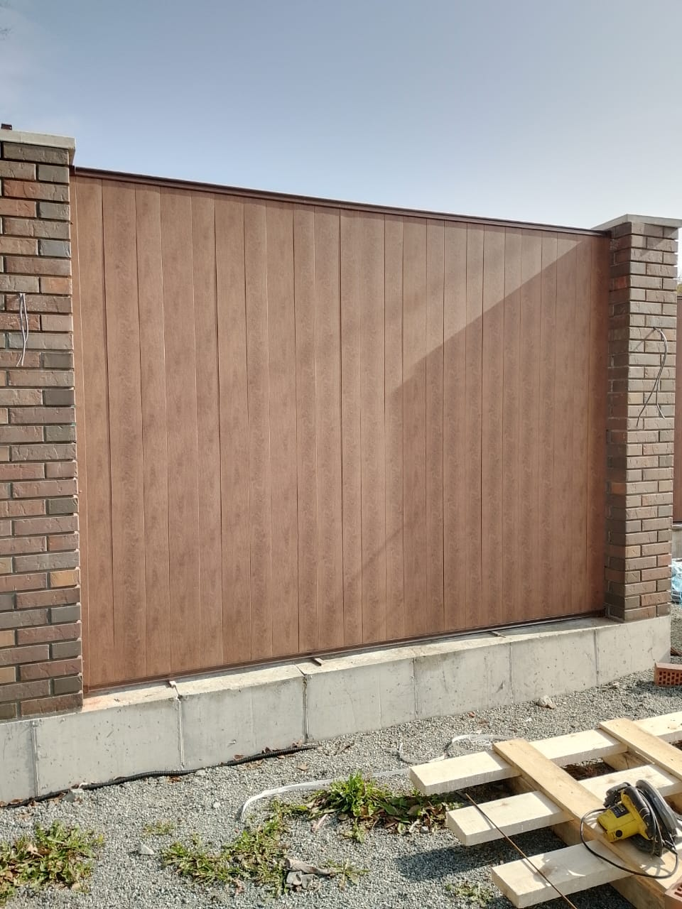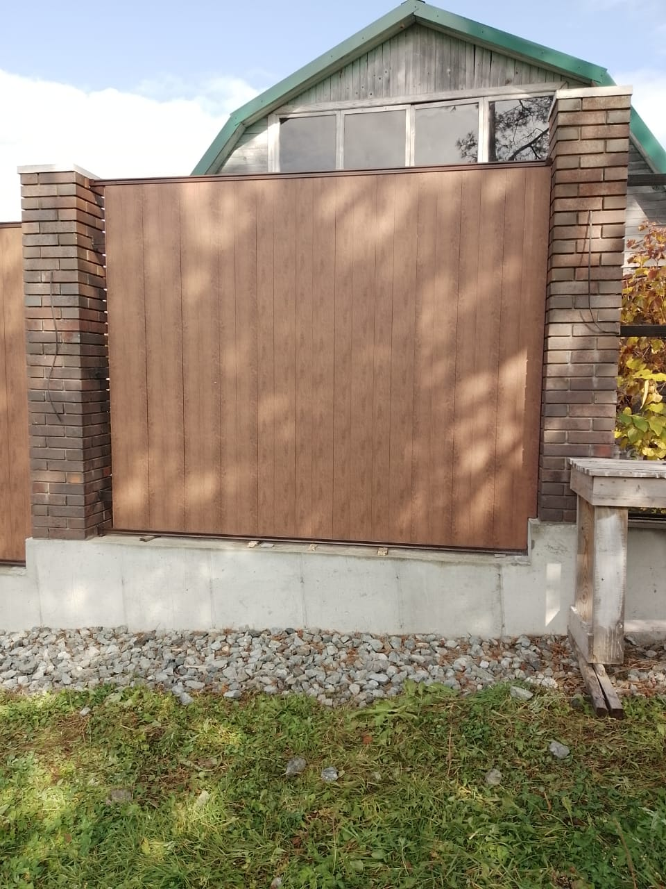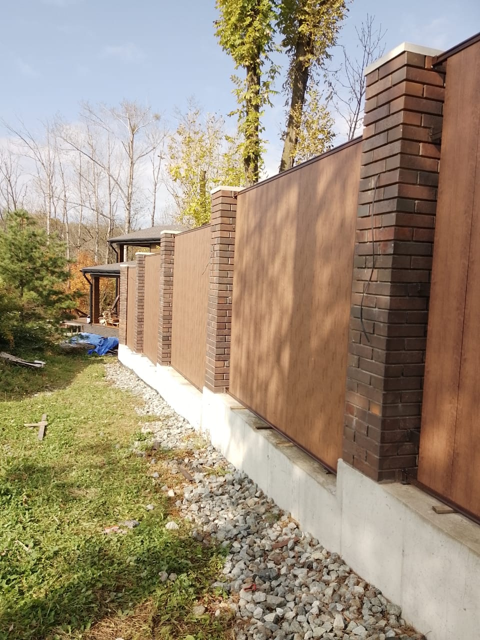 Штакетник (вертикальное расположение ламелей) с расстоянием 20 мм, столб кирпичный.
