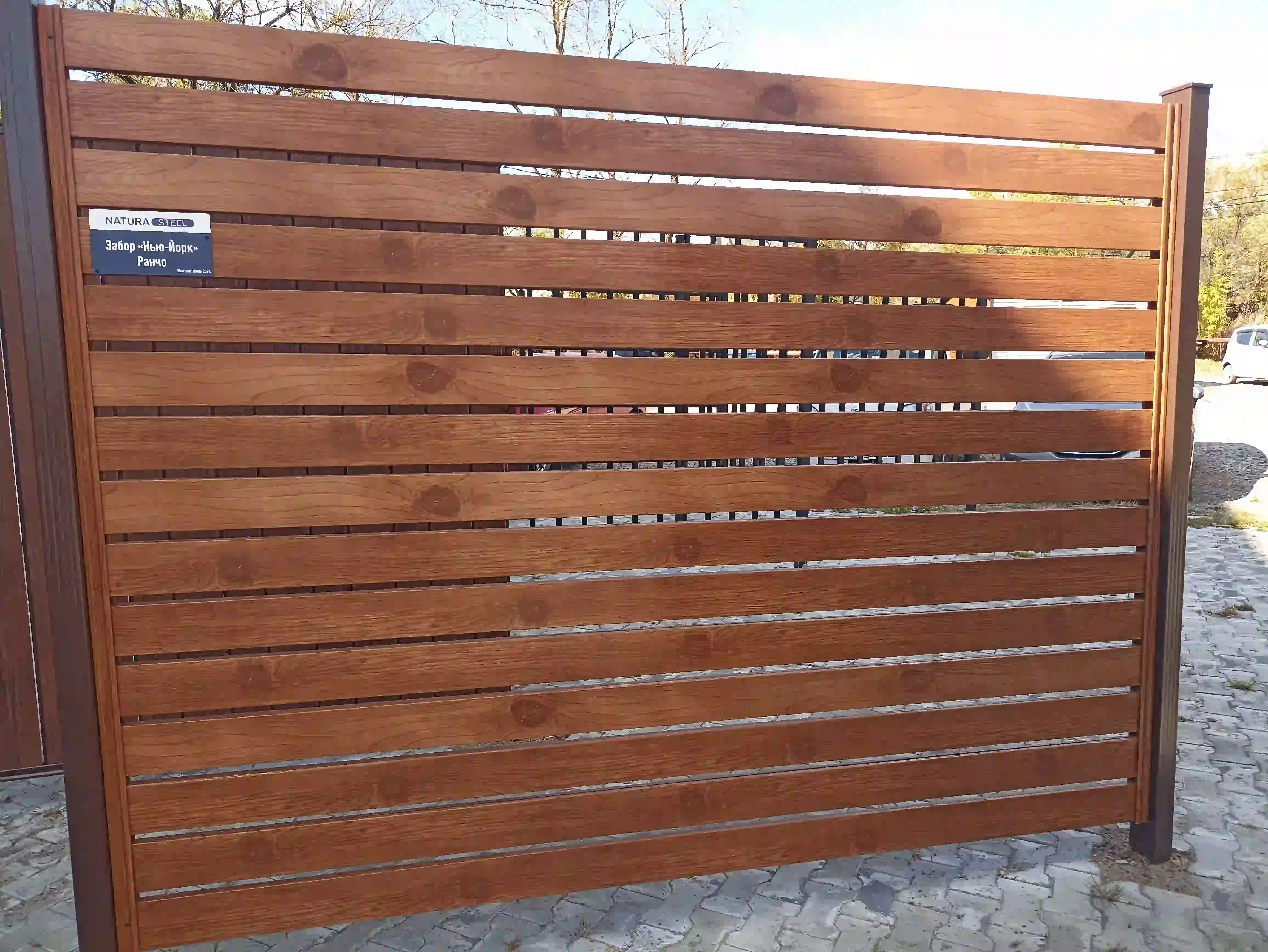 Natura Steel Нью-Йорк Ранчо - это секционное ограждение, имитирует забор из деревянной доски 100х25, но в отличии от забора из дерева, не подвержен неблагоприятному воздействию окружающей среды.